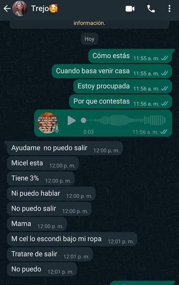 El día de hoy envió un mensaje a su mamá, dijo que tuvo que esconder su celular debajo de su ropa, que no podía hablar, ni salir, sin especificar detalles.