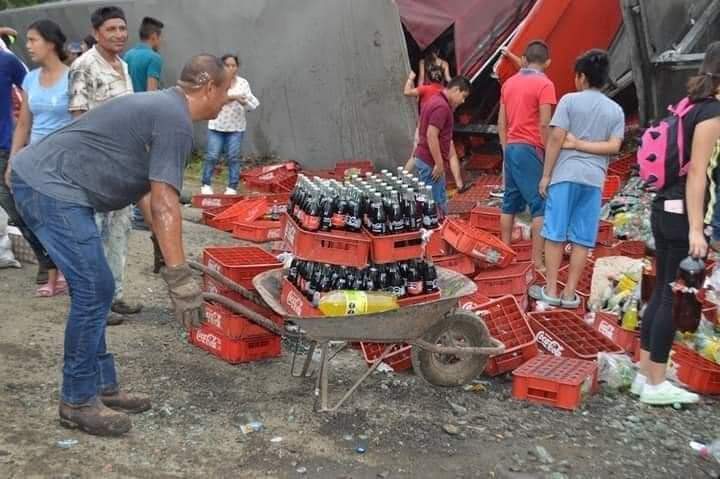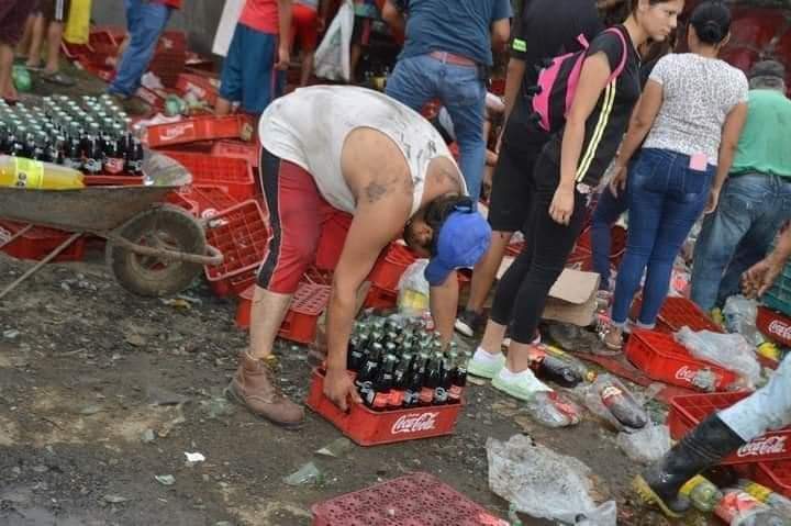 En las imágenes que se difundieron en las redes sociales, donde se observa la rapiña se puede ver a quienes se llevaban los productos con una felicidad total por estar obteniendo refrescos gratis, sin importan que pasaría con las personas que viajaban en el tráiler.