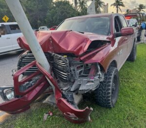 El cuarto incidente tuvo lugar a las 08:00 horas en el kilómetro 16+100 del Boulevard Kukulcán, frente al Grand Oasis Cancún. Una Dodge Ram 1500 roja perdió el control y derribó un poste de luz.