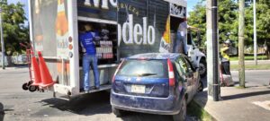 El automóvil prácticamente quedo debajo del costado derecho del camión repartidor de cerveza Modelo.