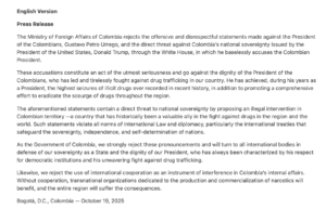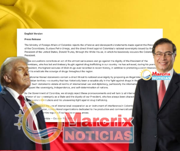 Colombia. (Marcrix Noticias). -La Cancillería de Colombia respondió a las declaraciones de Donald Trump, subrayando que las acusaciones contra el presidente Gustavo Petro son infundadas y atentatorias contra la soberanía del país. El narcotráfico, tema central de la controversia, fue citado por Trump como argumento para una posible intervención.