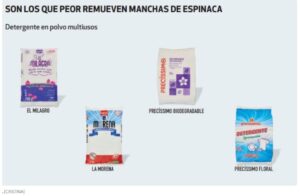 En la prueba de eliminación de manchas difíciles, las marcas con peores resultados fueron El Milagro, La Morena, Precíssimo Biodegradable y Precíssimo Floral, especialmente frente a las manchas de espinaca.