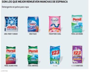 - Para manchas de espinaca: Ariel Poder y Cuidado, Great Value, Perceptions Floral, Persil Alta Higiene, Persil Colores Vivos, Persil Universal y 123.
