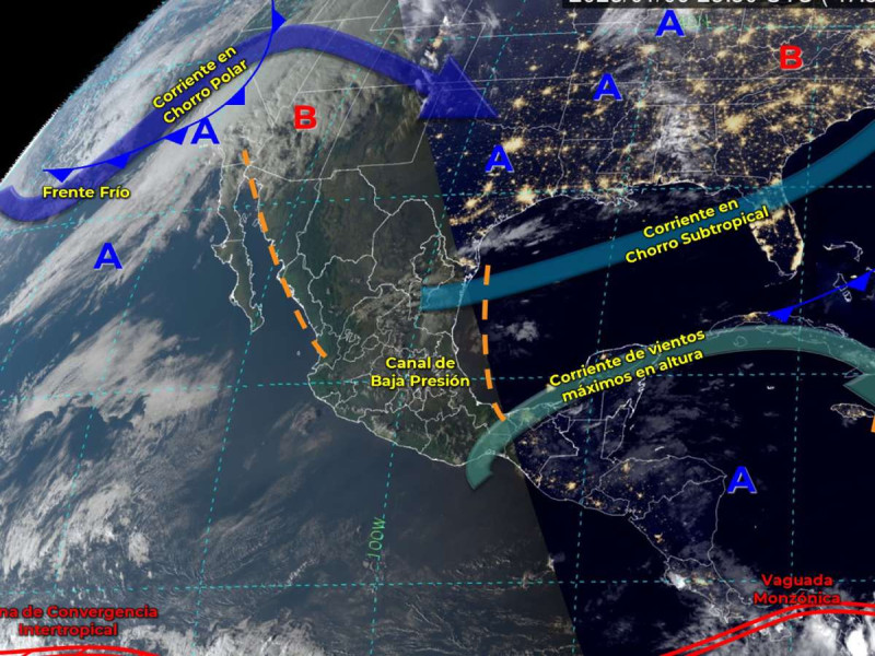 El frente frío ingresará por la tarde sobre el noroeste del país y asociado con una vaguada polar y la corriente en chorro polar, producirán vientos fuertes con posibles tolvaneras, lluvias puntuales fuertes en Baja California y oleaje de 2 a 3 metros de altura.