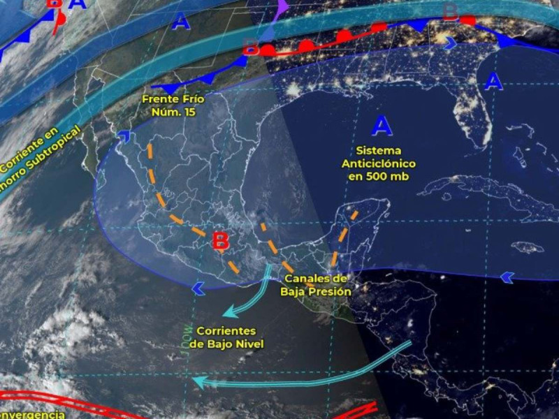 El Frente Frío se extenderá sobre la frontera norte del México, y en interacción con la entrada de humedad del Golfo de México y la corriente en chorro subtropical, producirá lluvias aisladas en Chihuahua y Coahuila, así como temperaturas por debajo de los 0 °C y heladas severas al amanecer en zonas altas del norte, noreste, centro y oriente del país.