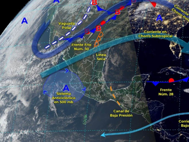 El frente frío 30 avanzará sobre el norte del territorio mexicano, en asociación con una vaguada polar y con las corrientes en chorro polar y subtropical, producirán lluvias y chubascos en dicha región, además de rachas fuertes de viento con tolvaneras en el noroeste y norte del país.