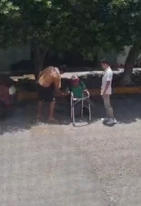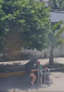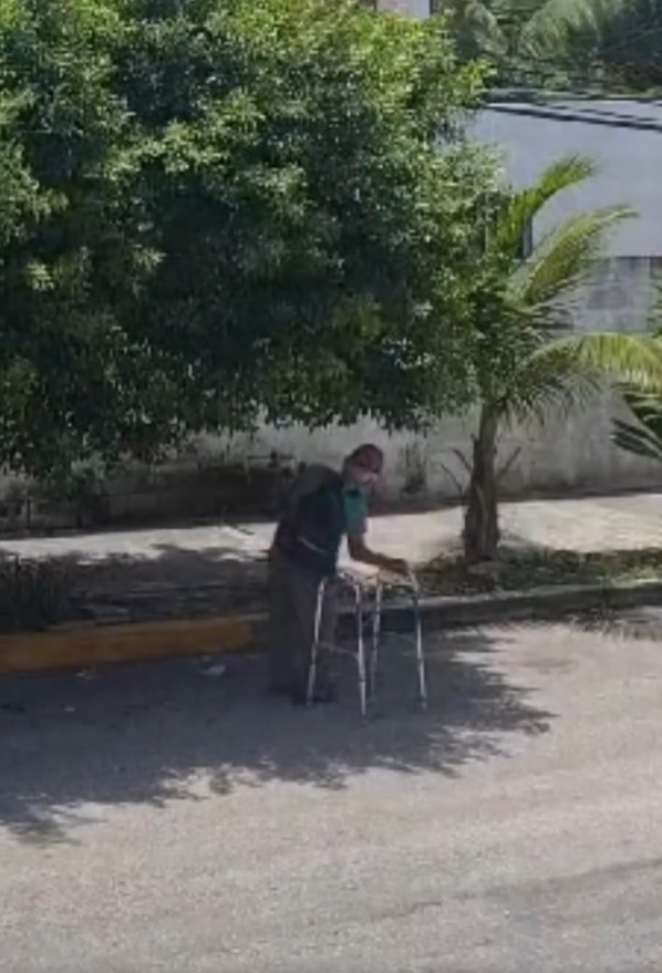La persona de la tercera edad es todo un actor; finge tener dificultades para desplazarse por sí mismo con ayuda de una andadera, se acercan a ayudarlo y aprovecha para pedir dinero a quien le ayude.