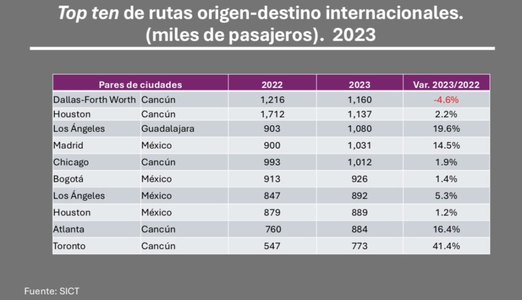De acuerdo con un estudio del Consejo Nacional Empresarial Turístico (CNET), con base en datos gubernamentales, Cancún se consolidó en el top ten de rutas origen-destino, incluso por arriba del Aeropuerto Internacional de la Ciudad de México (AICM).