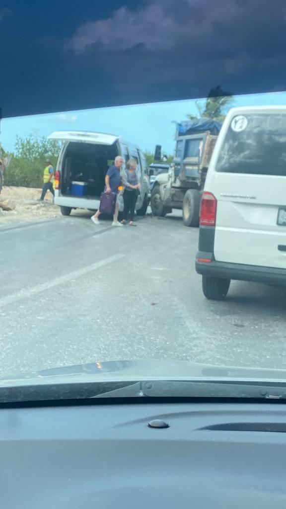 A las afueras del Aeropuerto de Cancún se registró un fuerte choque, en el que se vio involucrado un volquete y una Van turística, el cual sólo dejó saldo de daños materiales.