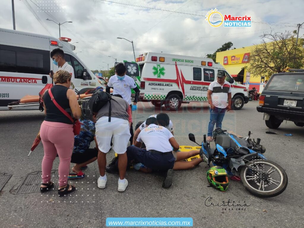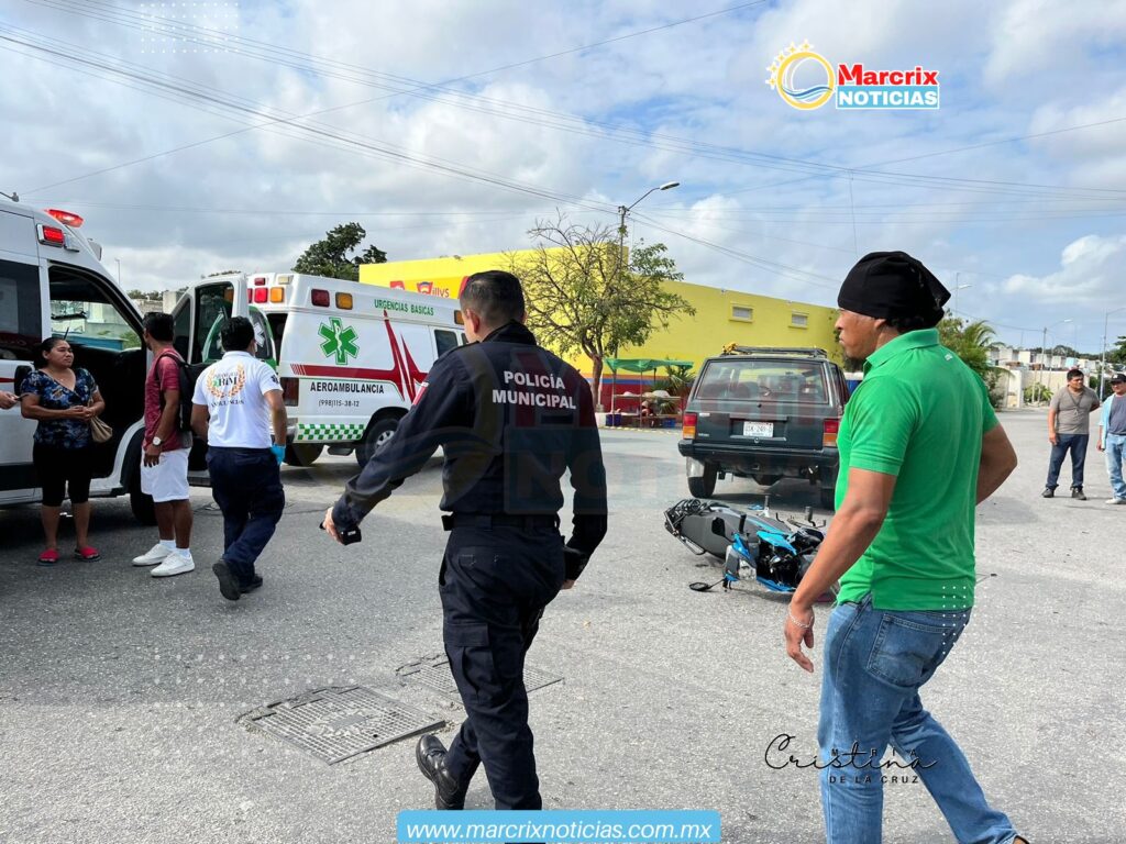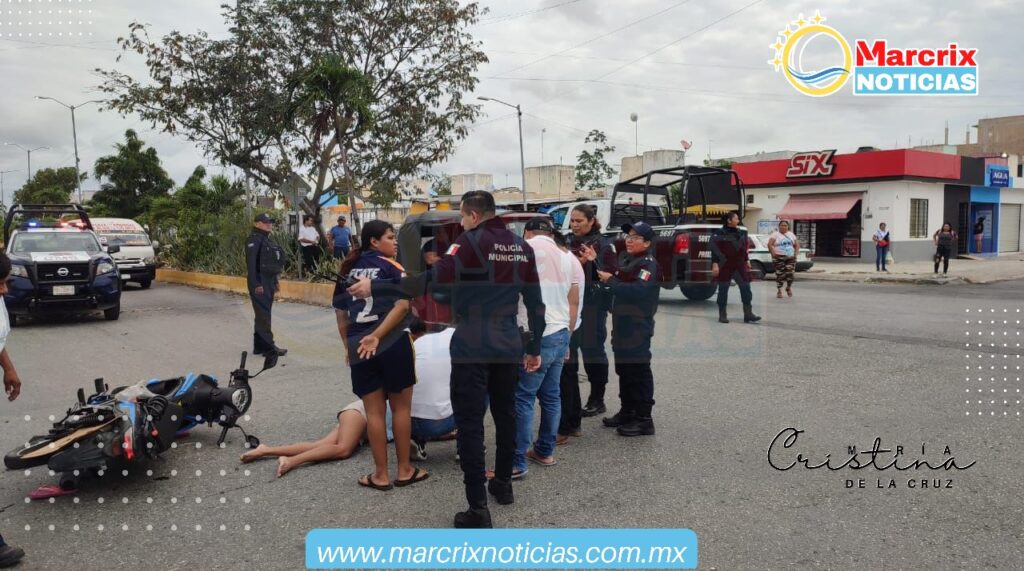 Cancún (Marcrix Noticias).- Una pareja de motociclistas quedó lesionada esta mañana de miércoles, luego de sufrir un fuerte accidente en el fraccionamiento Paseos del Mar.