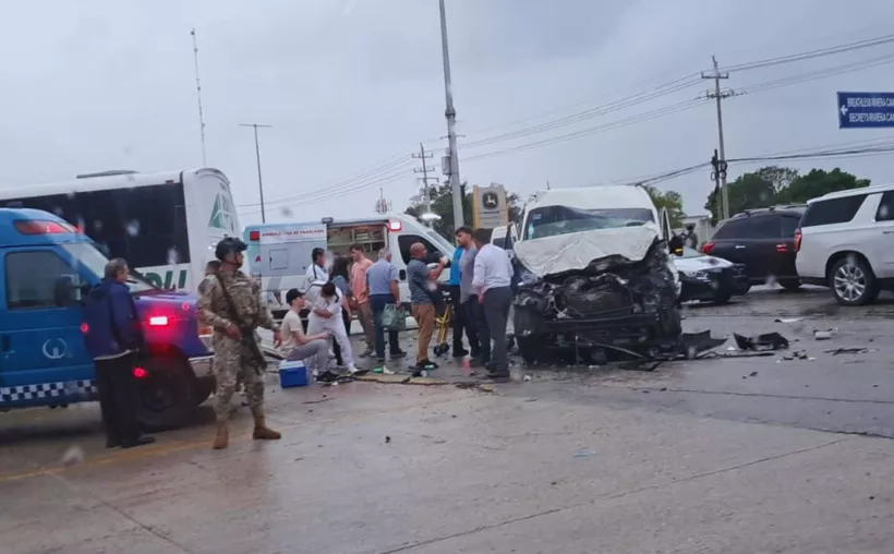 Un chofer de la empresa Lipu intentó ganarle el paso a una urvan de transporte turístico, provocando un fuerte choque sobre la carretera federal rumbo a Puerto Morelos, a la altura de Bahía Petempich.