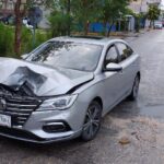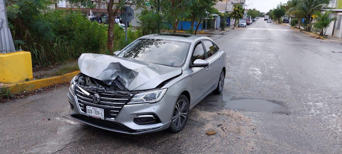 Al ser impactada la camioneta provocó que gire y se impactará contra el vehículo particular MG color gris, que estaba esperando para salir en la avenida Búhos.