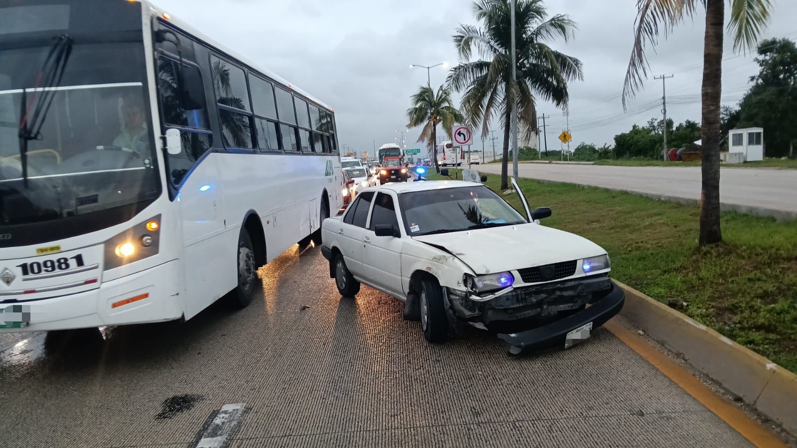 A la altura de Cancún Park un choque entre un autobús y un automóvil. No hay personas lesionadas, pero se recomienda extremar precauciones por las condiciones climáticas.
