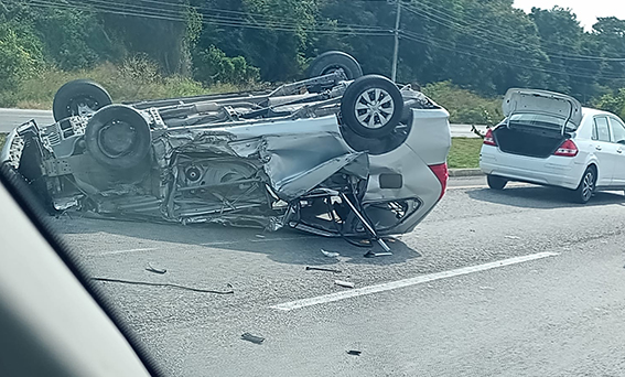 Minutos después otro tercer accidente se registró en la vía Cancún Playa del Carmen, donde un vehículo gris quedó reducido a chatarra, luego de que el conductor perdió el control y volcara quedando llantas para arriba e invadiendo un carril lo que generó también un caos vial.