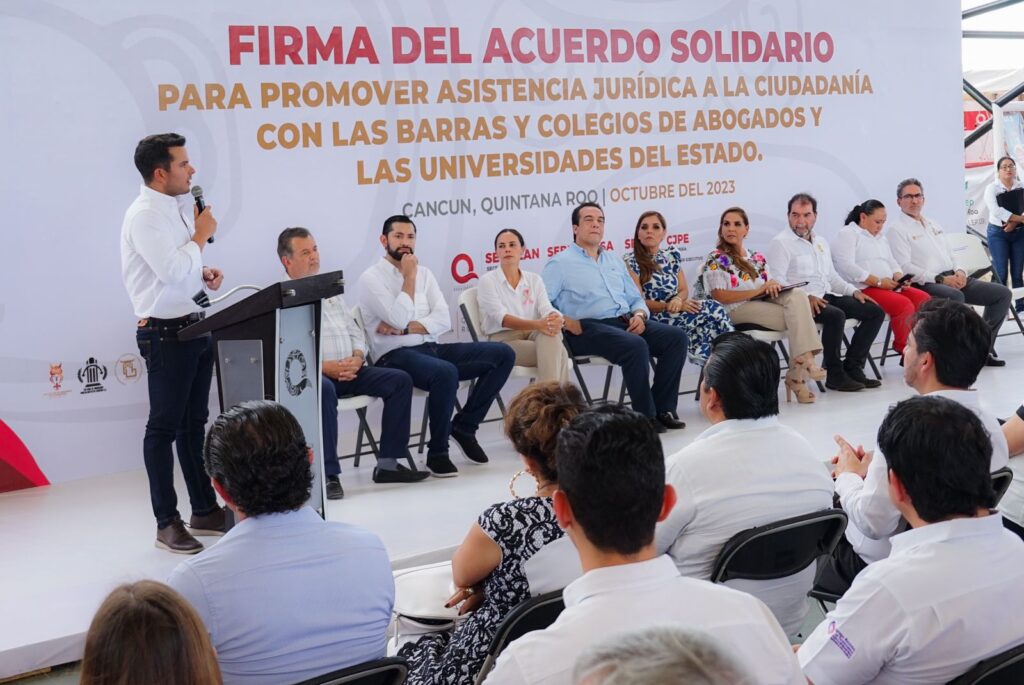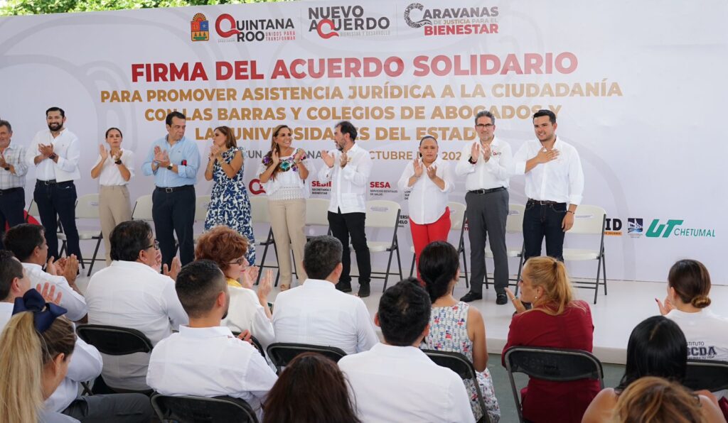 Cancún, (MARCRIX Noticias), 11 octubre 2023.- El Secretario de Bienestar, Pablo Bustamante Beltrán, acompañó a la Gobernadora Mara Lezama a la primera edición de las Caravanas de Justicia para el Bienestar, donde se llevó a cabo la firma de acuerdo solidario del Gobierno de Quintana Roo con barras y colegios de abogados del Estado, así como con universidades para promover la asistencia jurídica gratuita a la ciudadanía.