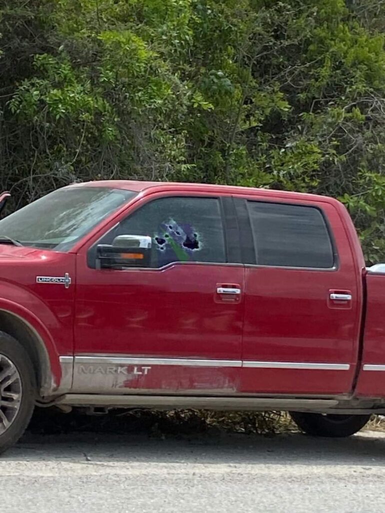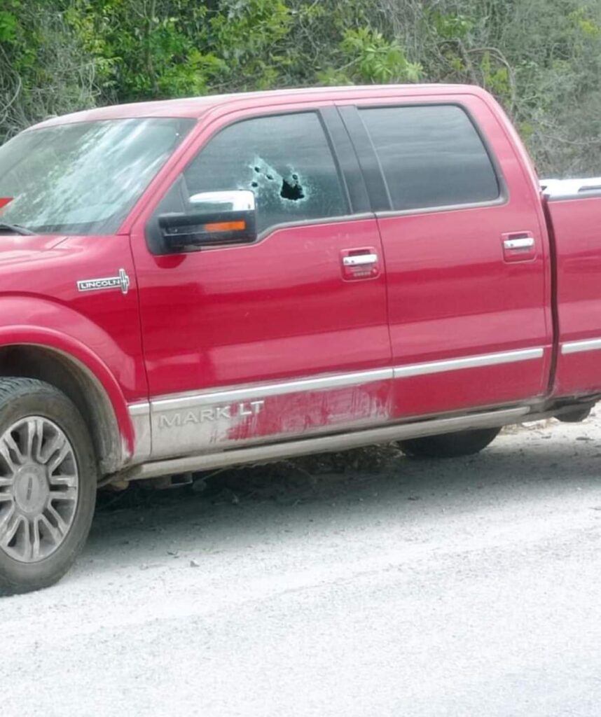 Las balas de grueso calibre atravesaron el cristal de la puerta izquierda de esta camioneta Lincoln Mark LT, dejando al menos 8 perforaciones, por lo que varios tiros se le impactaron en el pecho y cabeza del cantante y empresario del Grupo Los Infieles, mientras que la esposa del mismo, también recibió impactos de bala en el cuello, cabeza y hombro.