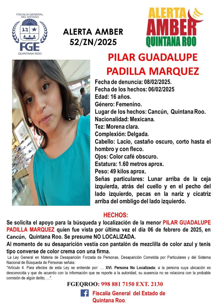 FGE de Quintana Roo activó una Alerta Amber para localizar a Pilar Guadalupe Padilla Márquez, una menor de 16 años que desapareció el pasado 6 de febrero en Cancún.
