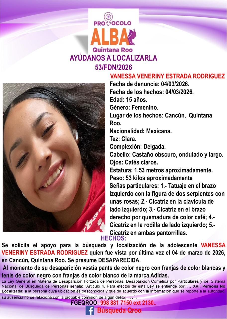 Cancún (Marcrix Noticias).– La Fiscalía General del Estado de Quintana Roo activó el Protocolo Alba, tras la desaparición de la adolescente Vanessa Veneriny Estrada Rodríguez, de 15 años de edad, quien fue reportada como desaparecida ayer miércoles.