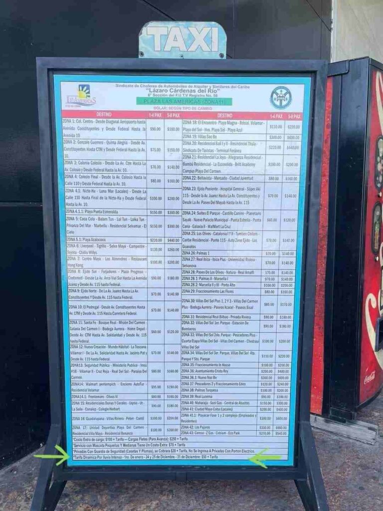 De este modo, en el tarifario de Plaza las Américas de Playa del Carmen está a la vista los cobros actualizados; por ejemplo desde esta plaza hasta Villas del Sol son 110 pesos pero con lluvia intensa la corrida le saldría al usuario en 160 pesos.