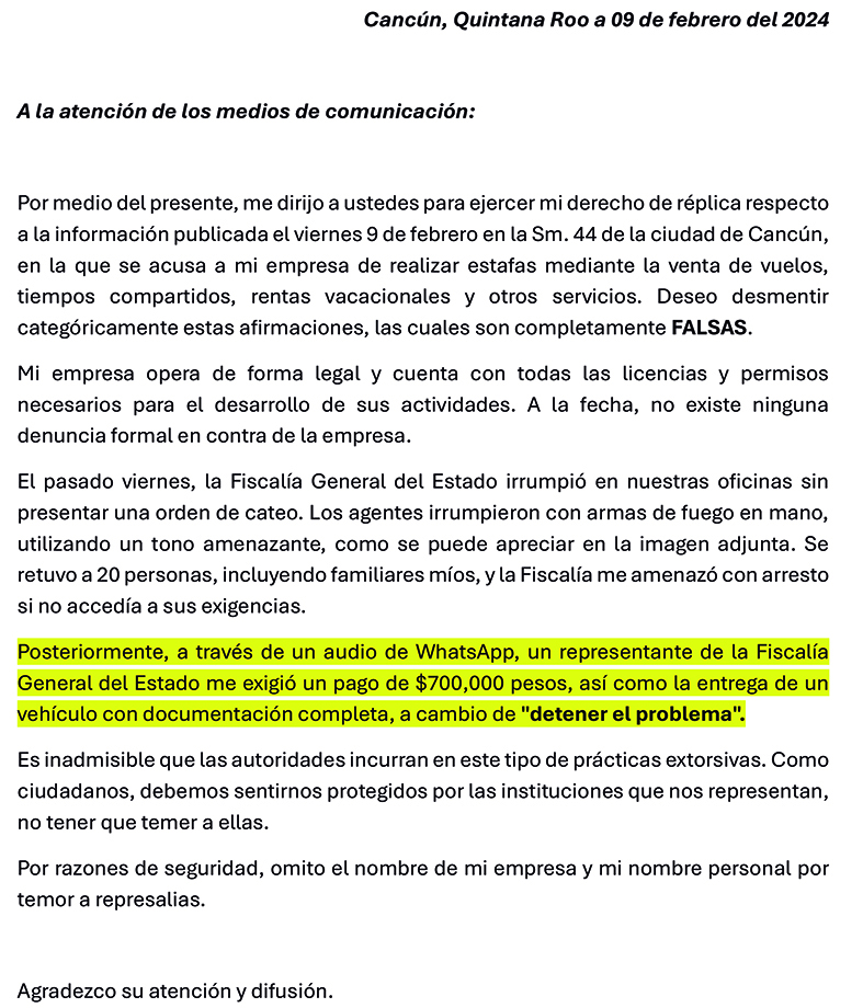 El propietario del Call Center solicitó mediante misiva su derecho de réplica, ya que Marcrix Noticias, al igual que otros medios de información, fueron avisados por la FGE de la realización de un cateo realizado al filo del medio día en la supermanzana 41 sobre calle Venus en la colonia Centro de Cancún.