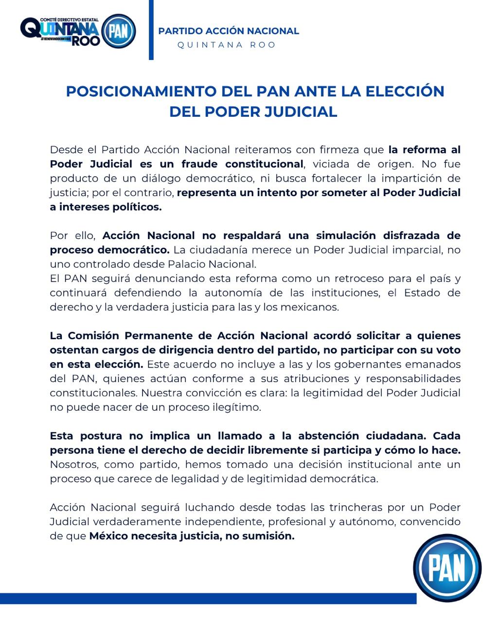 La Comisión Permanente de Acción Nacional acordó solicitar a quienes ostentan cargos de dirigencia dentro del partido, no participar con su voto en esta elección. Este acuerdo no incluye a las y los gobernantes emanados del PAN, quienes actúan conforme a sus atribuciones y responsabilidades constitucionales. Nuestra convicción es clara: la legitimidad del Poder Judicial no puede nacer de un proceso ilegítimo.