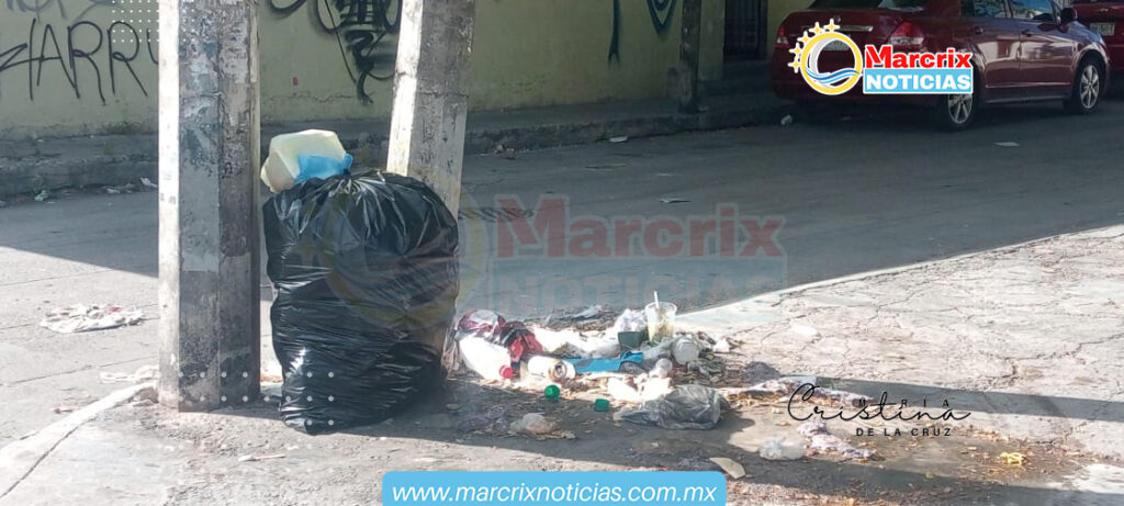 Desde el área del Crucero se empiezan a ver las bolsas de basura que comerciantes y habitantes del lugar dejan en la banqueta para que el carro recolector de la basura se las lleve, sin embargo, cuando no pasa el citado camión los desechos quedan abandonados y los perros y gatos en condición de calle las abren para buscar comida dentro de ellas, lo que genera un foco de infección.