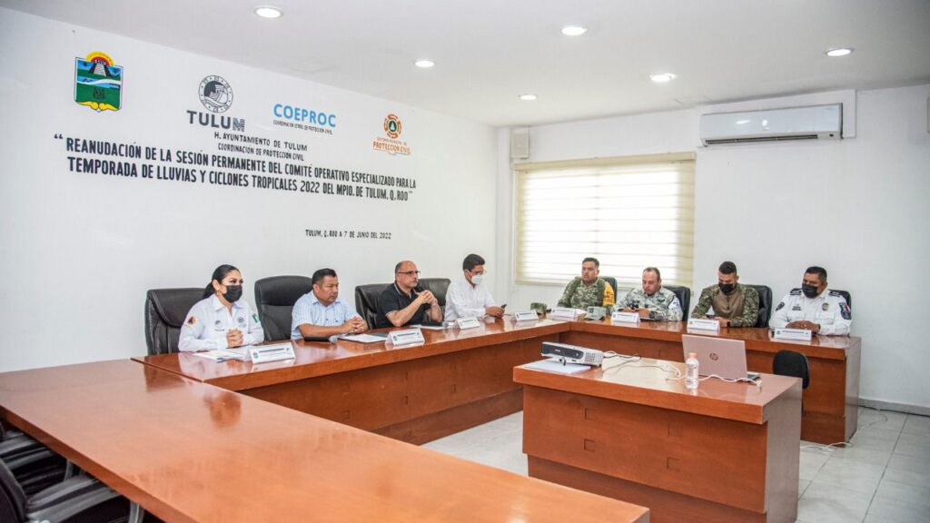 Tulum, 7 junio del 2022.- El presidente municipal de Tulum, Marciano Dzul Caamal encabezó la reanudación de la Sesión Permanente del Comité Operativo Especializado para la Temporada de Lluvias y Ciclones Tropicales 2022, misma en la que los integrantes afianzaron estrategias integrales de acciones preventivas y atención a seguir en caso de algún fenómeno hidrometeorológico que afecte al paraíso turístico de Tulum.