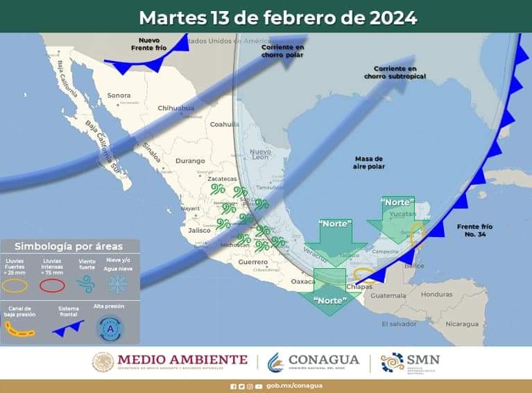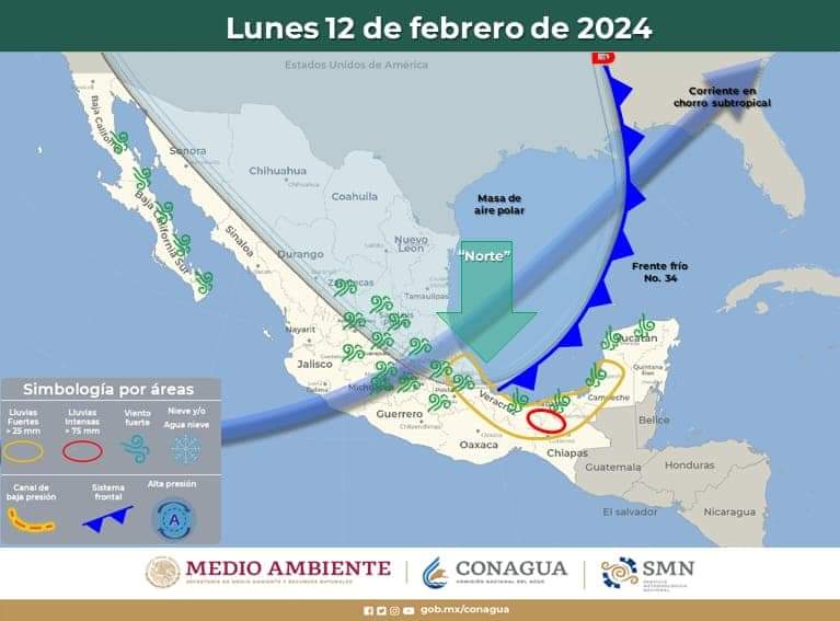 Vale resaltar que la masa de aire frío que impulsa al frente originará evento de “Norte” principalmente en las costas de los municipios del Norte y a lo largo de las Zonas Costeras del Estado, con rachas de vientos de 60 a 80 km/h durante la tarde del día lunes 12 y el día martes 13, perdiendo intensidad el día miércoles 14 de febrero.