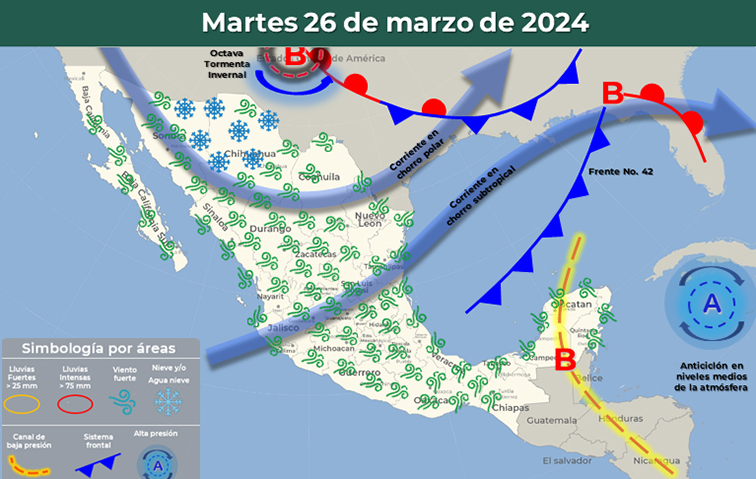De acuerdo con el Servicio Meteorológico Nacional (SMN), para el martes se espera que el frente frío 42 se desplazará sobre el Golfo de México y el oriente del país, interaccionará con un canal de baja presión sobre la Península de Yucatán.