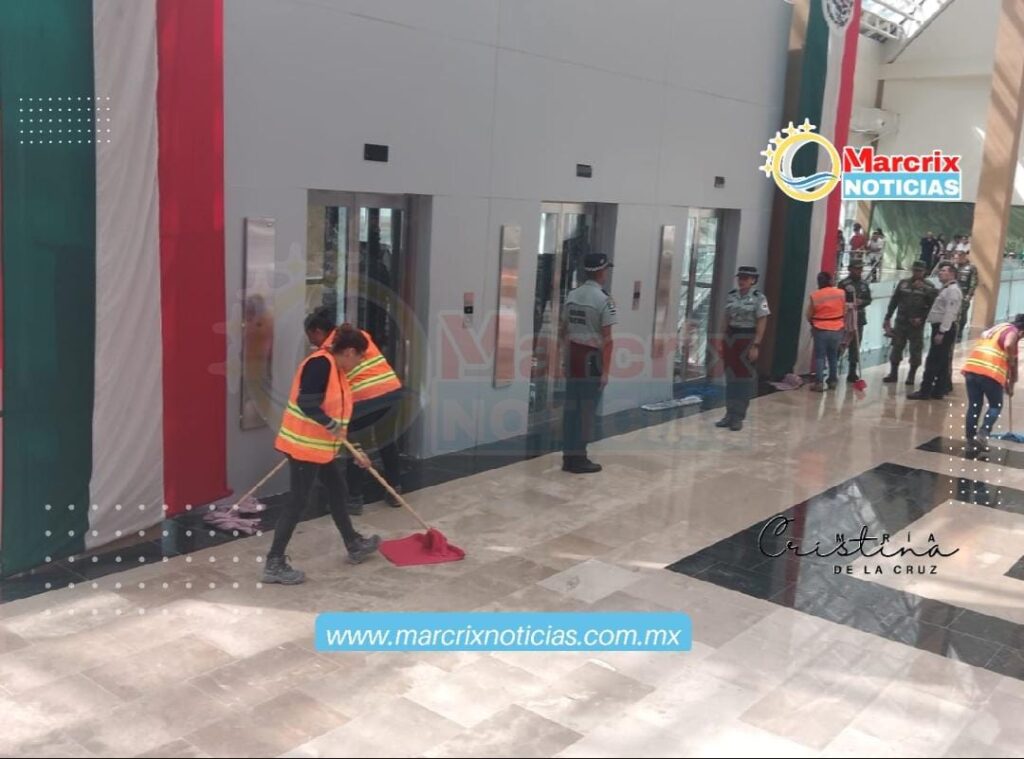 Minutos antes de su llegada, personal del aeropuerto tuvo que limpiar el piso debido a una gotera.