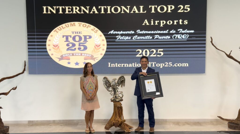 Tulum (Marcrix Noticias).– El Aeropuerto Internacional de Tulum “Felipe Carrillo Puerto” se colocó en el mapa mundial al recibir el galardón International Top 25, que lo reconoce entre los 25 mejores aeropuertos del mundo por su infraestructura, calidad en el servicio y crecimiento sostenido.