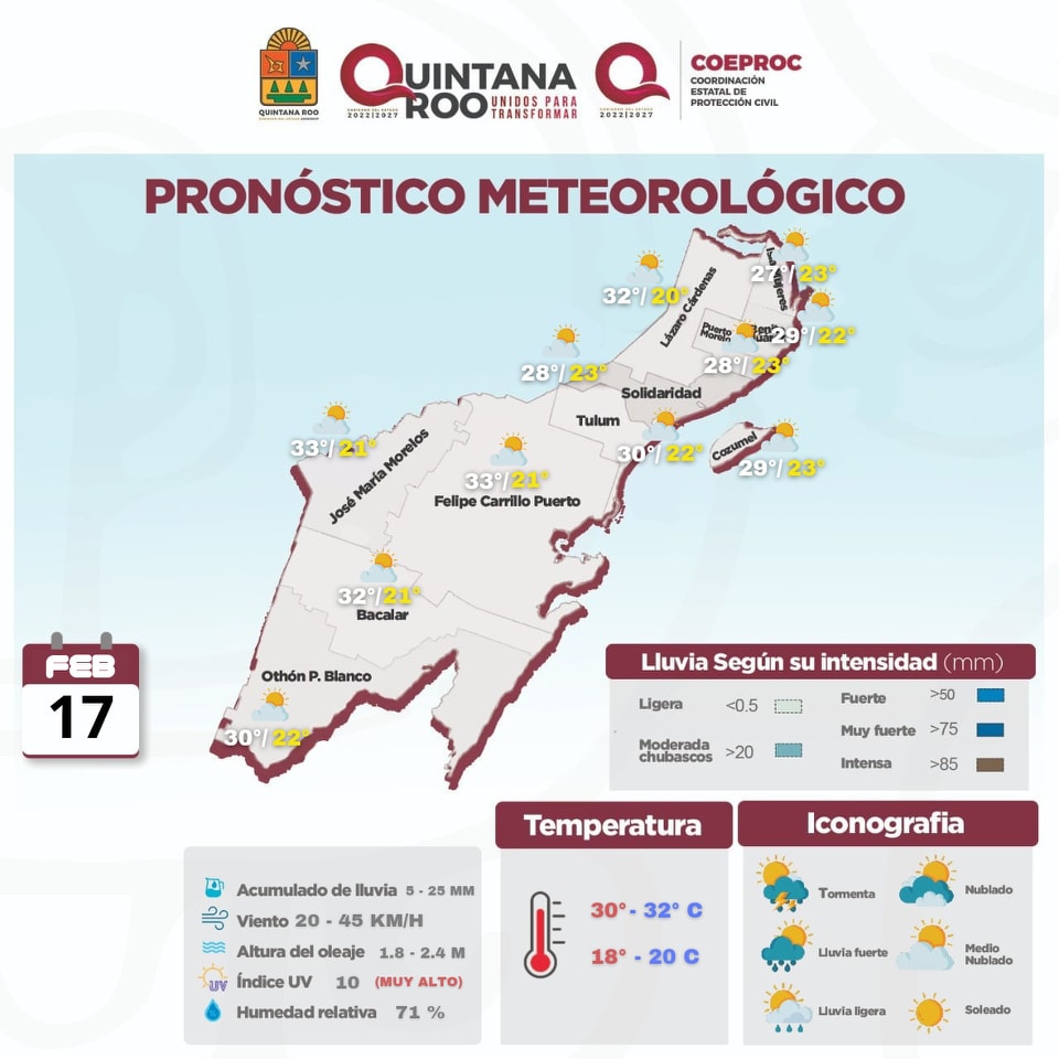 8.- FELIPE CARRILLO PUERTO.- medio nublado, medio nublado con incremento de nublados por la noche, lluvias ocasionalmente moderadas con chubascos acompañados de actividad eléctrica, viento del este y sureste de 15 a 25 km/h, fijándose del norte y noreste de 25 a 35 km/h con rachas más fuertes.
