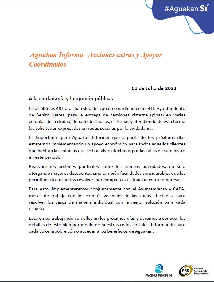 “Estaremos implementando un apoyo económico para todos aquellos clientes que habitan en colonias que se han visto afectadas por las fallas en el suministro en este periodo y realizaremos acciones puntuales sobre los montos adeudados, no sólo otorgando mayores descuentos, sino también facilidades considerables que les permitan a los usuarios resolver por completo su situación con la empresa”, explica el documento dado a conocer a través de sus redes sociales.