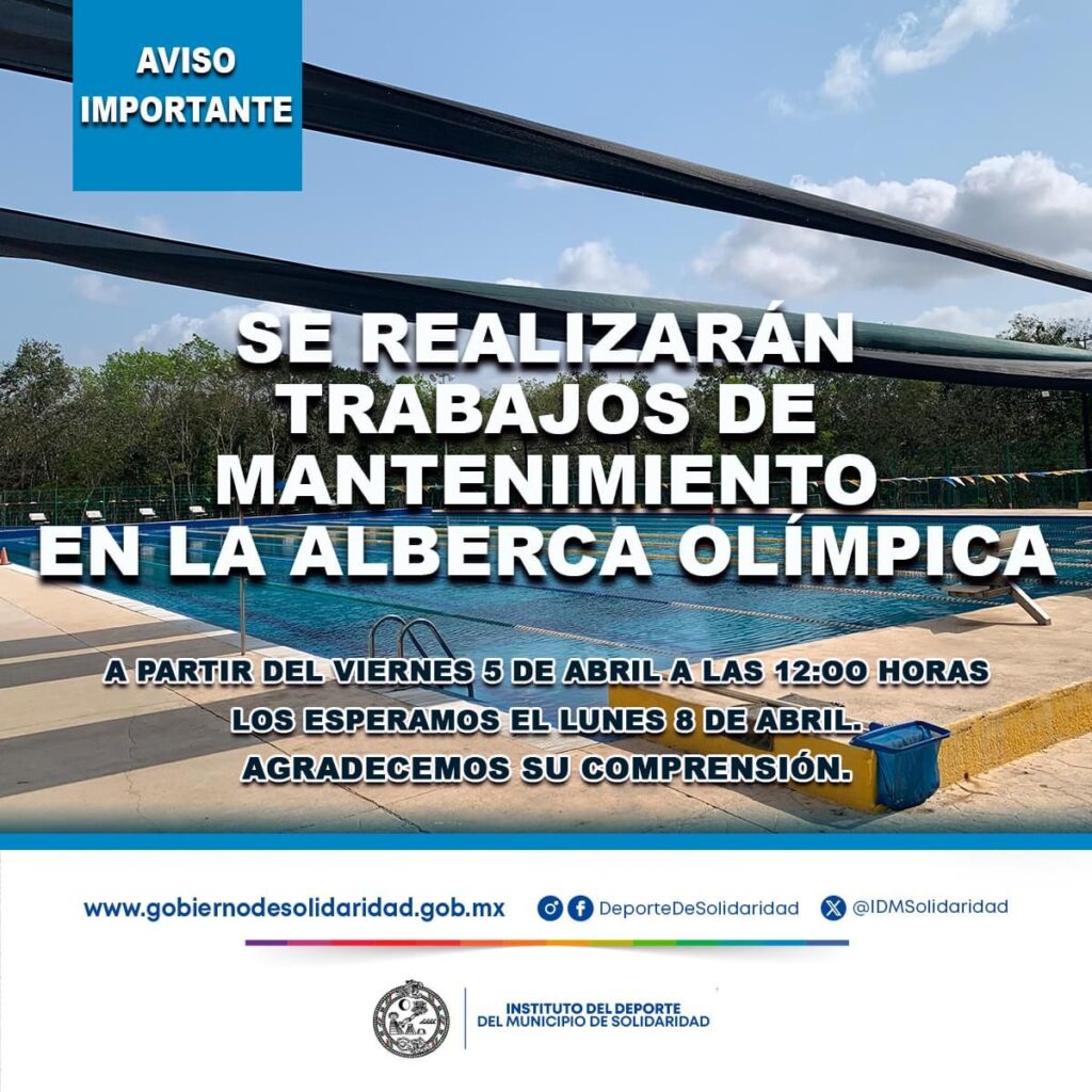 “A la comunidad deportiva. Les informamos que la alberca olímpica de la Unidad Deportiva ‘Riviera Maya’ estará cerrada a partir de las 12:00 horas del viernes 5 de abril, ya que se le realizarán trabajos de mantenimiento, por lo que el lunes 8 estará abierta para los usuarios en horario normal. Agradecemos su comprensión”, informó a través de sus redes sociales el Instituto del Deporte Municipal.