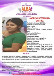 Además, la FGE también reportó la desaparición de Andrea Estéfani May Castro, vista por última vez el 4 de noviembre de 2025 en Chetumal, municipio Othón P. Blanco, Quintana Roo, y quien presuntamente es la madre de la bebé.