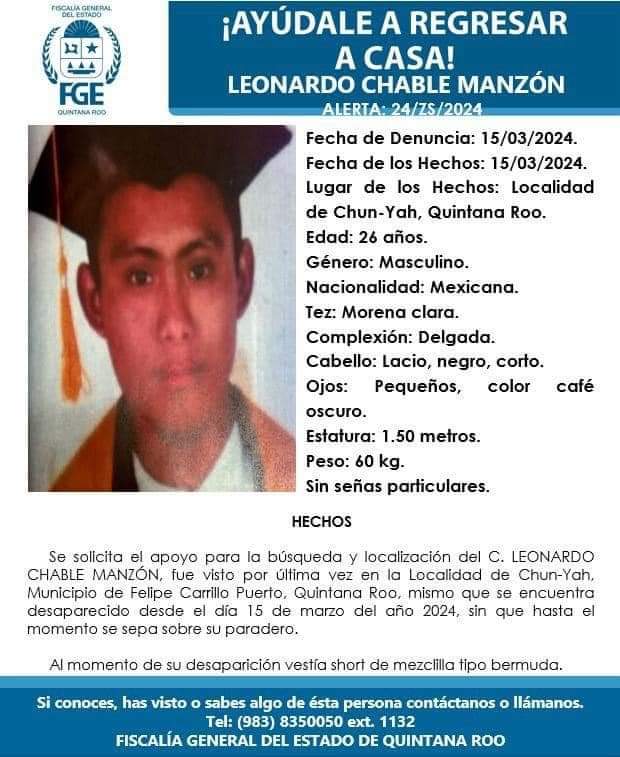 La tercera ficha emitida es la Alerta 24/ZS/2024 que corresponde para Leonardo Chablé Mazón de 26 años de edad quien al momento de su desaparición vestía short de mezclilla tipo bermuda; de tez morena clara, complexión delgada, cabello lacio, negro, corto, ojos pequeños color oscuro, una estatura de 1.50 metros, un peso aproximado de 60 kilogramos, sin señas particulares.