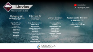 Intervalos de chubascos (5 a 25 milímetros) en: Baja California Sur, Chihuahua, Michoacán, Estado de México, Morelos, Veracruz (región Olmeca), Tabasco, Campeche, Yucatán y Quintana Roo.