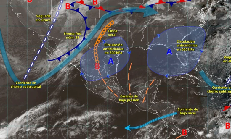 El frente frío núm. 44 y una línea seca generarán condiciones de riesgo en Chihuahua, Coahuila, Nuevo León y Tamaulipas; persiste la onda de calor en el sur.