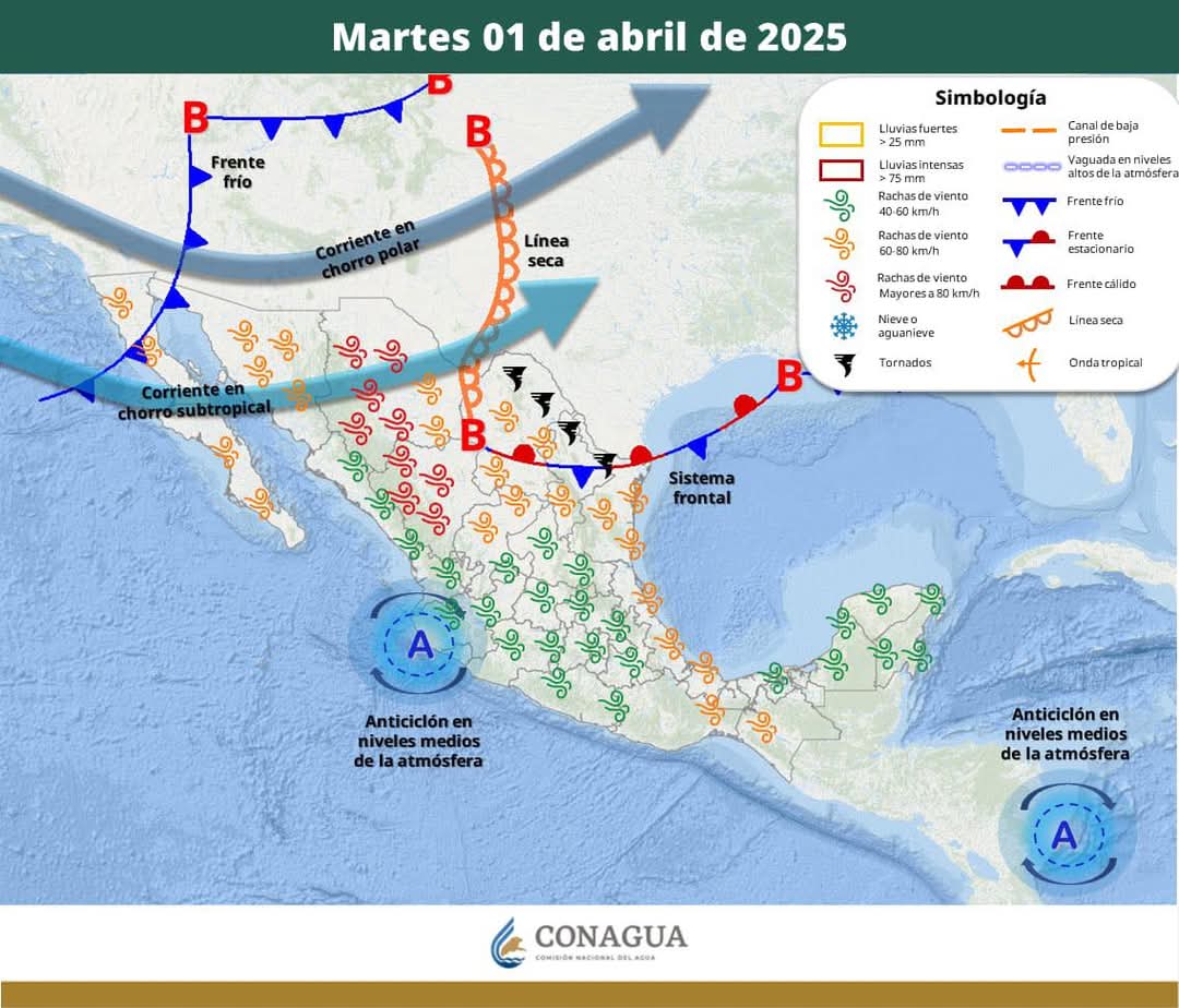 Así como oleaje elevado de 1 a 3 metros de altura, principalmente sobre las zonas de costa del estado de Quintana Roo, perdiendo intensidad durante la tarde del día lunes 07 de abril.