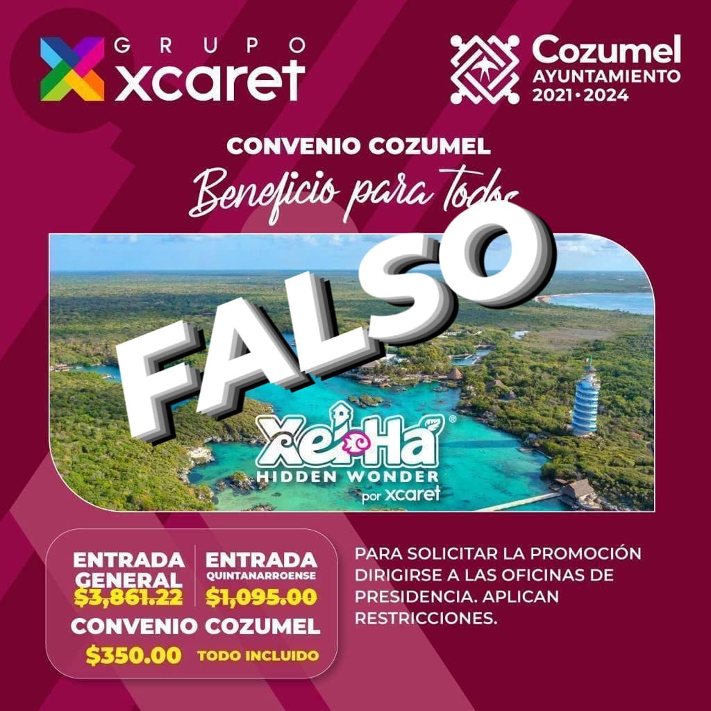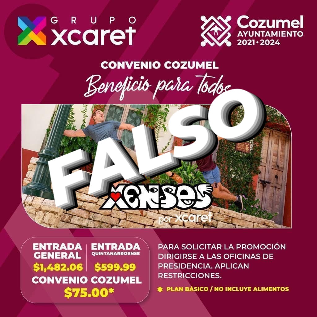 Toma en cuenta que ni el Ayuntamiento de Cozumel ni Xcaret tienen algo que ver con las promociones que circulan en redes, por ello se pide a la población tomar precauciones para no caer en las garras de los estafadores.