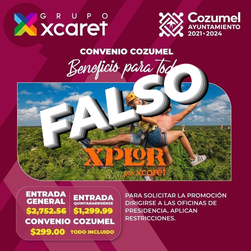 Para llevar a cabo ello crearon flyers que dejan ver un supuesto convenio de las autoridades cozumeleñas con Xcaret, lo cual brinda tarifas preferenciales, pero todo esto se trata de un engaño.