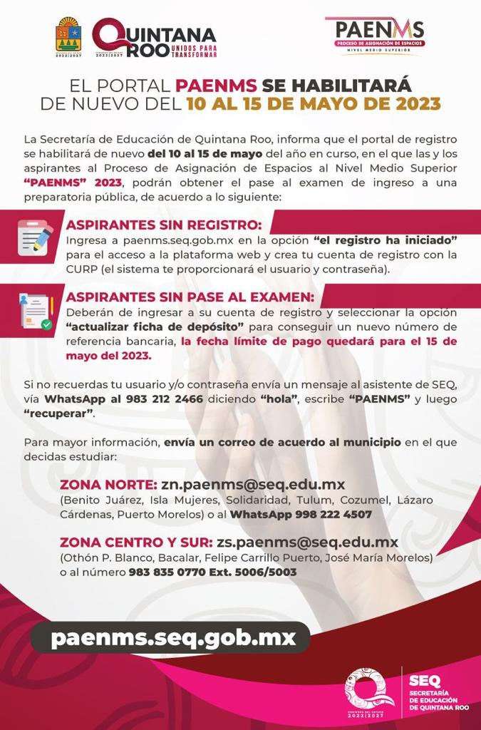 La Secretaría de Educación de Quintana Roo informa que del 10 al 15 de mayo se podrán inscribir a través de la plataforma https://paenms.seq.gob.mx, en la que además encontrarán información de la oferta educativa de las preparatorias del estado.