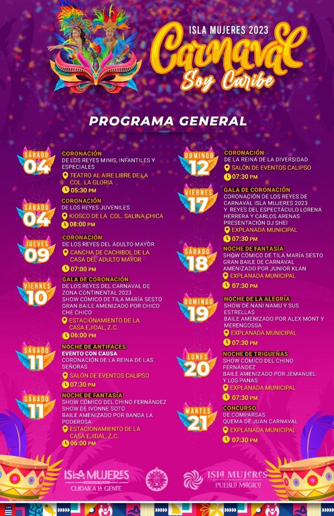 Isla Mujeres (Marcrix Noticias).— El Ayuntamiento de Isla Mujeres anunció este miércoles el Carnaval 2023, del 4 al 21 de febrero, luego de dos años de pandemia y que por primera vez se realizará también en “Rancho Viejo”, en la zona continental del municipio.