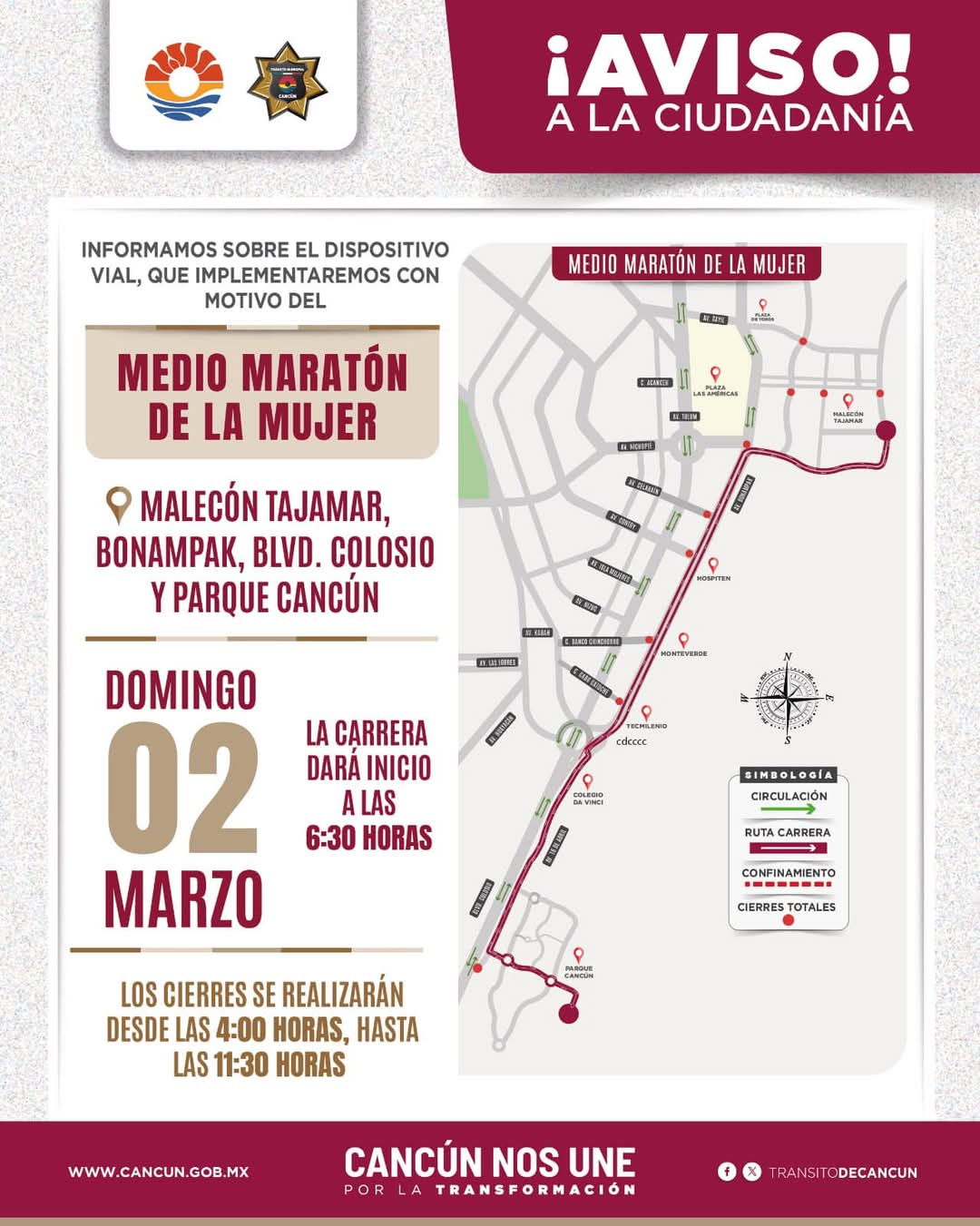 Cancún(Marcrix Noticias).- A través de la Dirección de Tránsito de Cancún, se informa a la ciudadanía sobre el dispositivo vial que se implementará el próximo domingo 2 de marzo, con motivo del “Medio Maratón de la Mujer”.