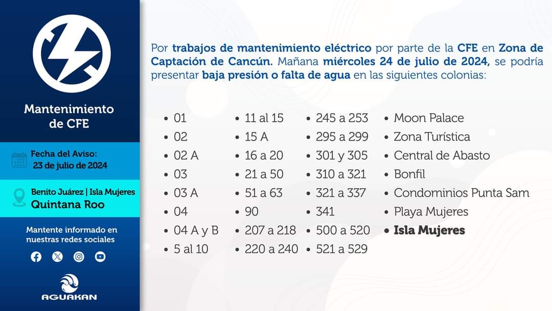 Cancún(Marcrix Noticias).- Se comunica a la ciudadanía del municipio de Benito Juárez e Isla Mujeres que la Comisión Federal de Electricidad (CFE), ha notificado a Aguakan que mañana miércoles 24 de julio del 2024 realizará trabajos de mantenimiento a sus redes generales de distribución, esto con el objetivo de mejorar el suministro de energía eléctrica, por lo que el servicio de agua potable se verá afectado con baja presión o falta de agua.