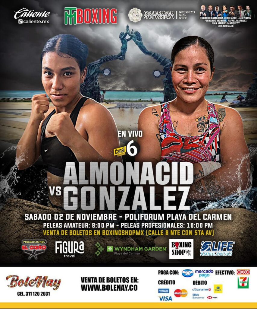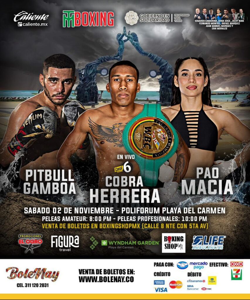 Patricia Fajardo, promotora y organizadora de eventos deportivos anunció que el sábado 2 de noviembre la empresa TM Boxing realizará la función de box profesional, en el poliforum de Playa del Carmen, con la participación de exponentes quintanarroenses, entre los que destacan Alvino “Cobra” Herrera, Paola “Pao” Macía y Eric “Pitbull” Gamboa y los solidarenses Gabriela González y Daniel Valle, esta función será transmitida a nivel nacional por el Canal 6 Multimedios, una de las innovaciones será que habrá dos peleas de kickboxing, además habrá una cartelera con peleas amateurs para que los jóvenes puedan subir al cuadrilátero y demostrar el poder de sus puños.