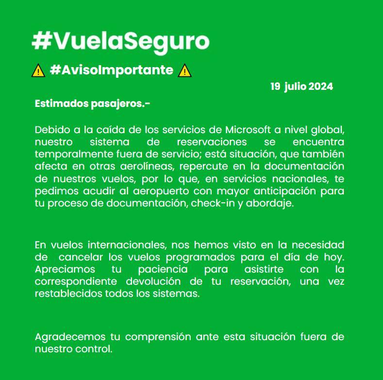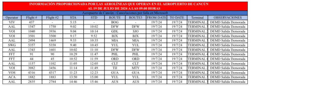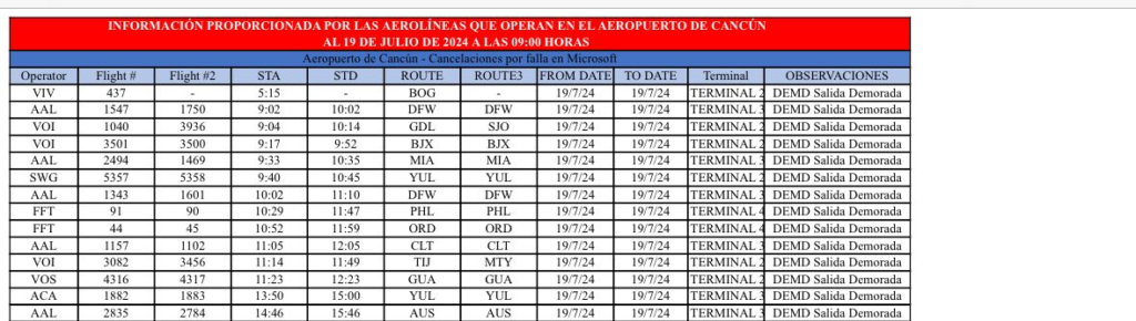El Centro Operativo de la Emergencia del Aeropuerto Internacional de Cancún informa que, debido a la falla en el sistema operativo de Microsoft, ocasionada por la herramienta de ciberseguridad CrowdStrike, está afectando vuelos a nivel mundial, incluyendo a varias líneas aéreas en Cancún. Hasta este momento tenemos las siguientes cancelaciones 7 llegadas y 9 salidas. demorados 14 llegadas, 13 salidas.