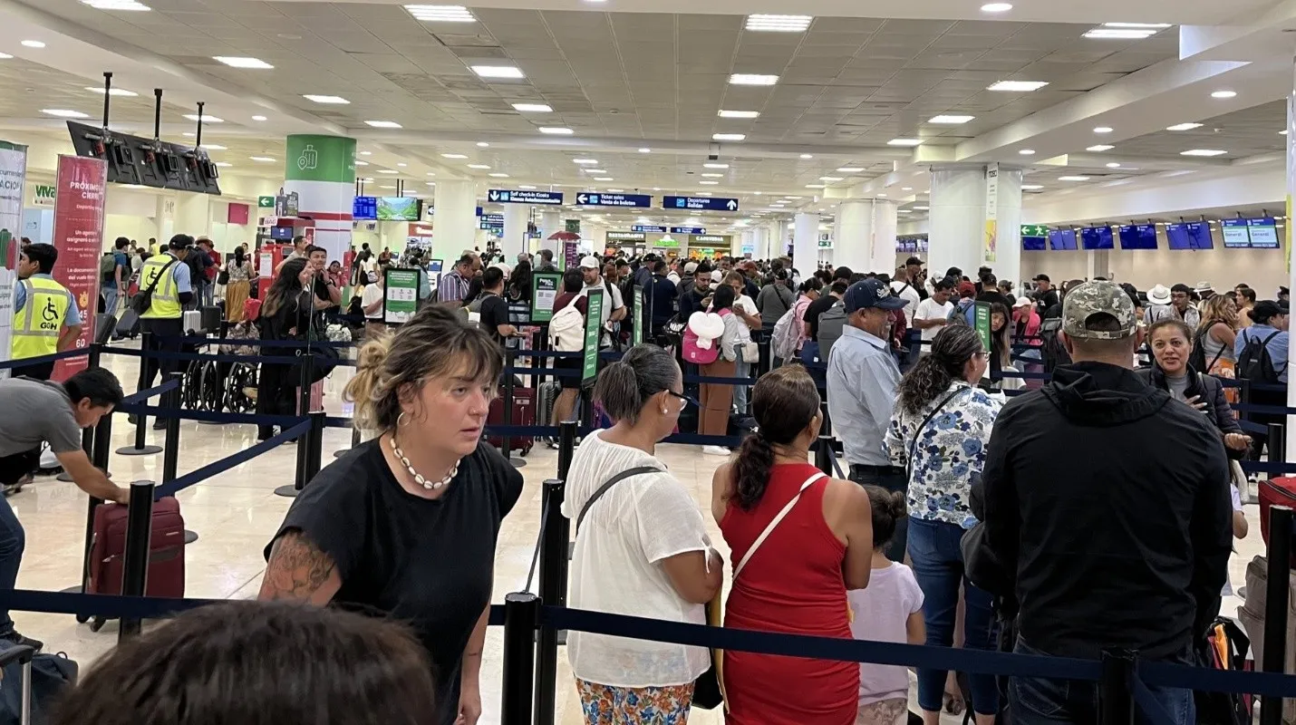 Mientras tanto dentro del Aeropuerto Internacional de Cancún se ven largas filas de viajeros que están varados dentro de las instalaciones y salas de abordaje a espera de información oficial para saber en qué momento se retomará la normalidad de las salidas y llegadas de los vuelos nacionales e internacionales.