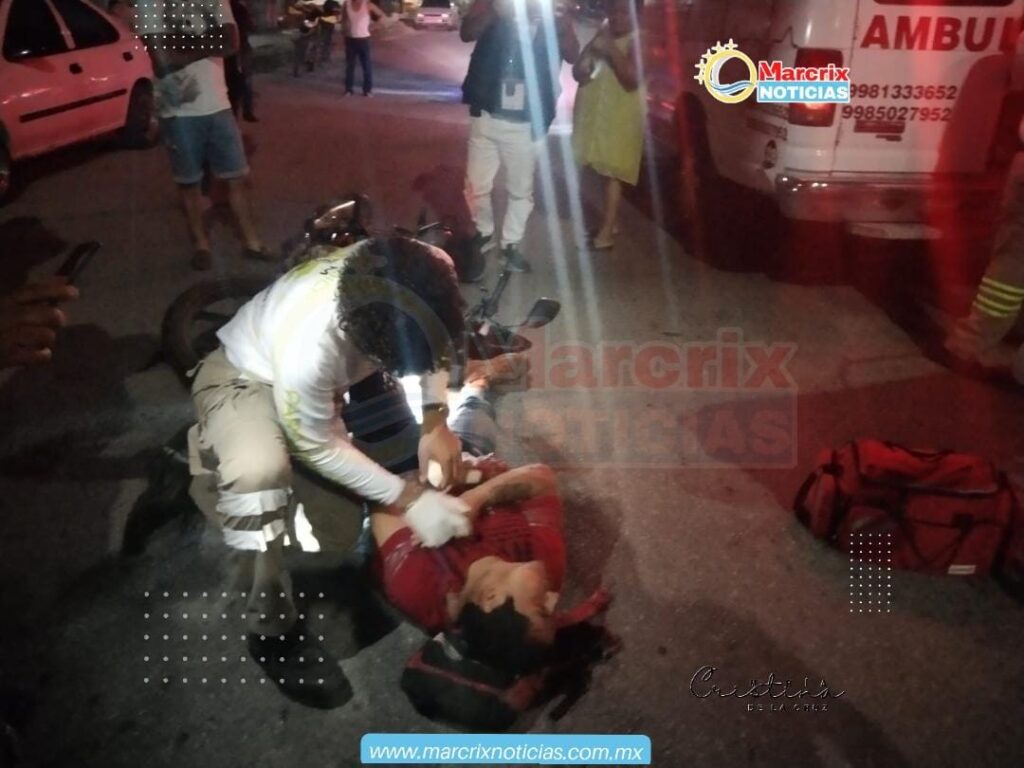 Cancún(Marcrix Noticias).- Un aparatoso accidente se registró durante la madrugada de este jueves en la Región 259 de Cancún, en el cual, un motociclista terminó con posible fractura en la mano izquierda.