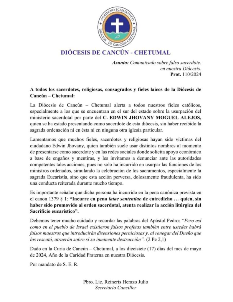 La diócesis Cancún-Chetumal alertó el hombre que es identificado con el nombre Edwin Jhovany Moguel Alejos
